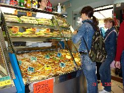 lutschender, große Pizzastücke im Laufen essende, orientierungsloser