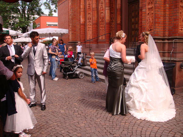 Marktkirche (Teilansicht): ein Bräutigam im Astronautenanzug skeptisch schauend auf Braut ganz in weiß. Viel Glück!