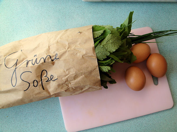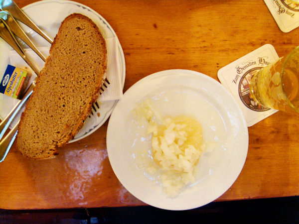 "Handkäse mit Musik" und (mouseover) so genannte "Bembel", gesehen im "Gemalten Haus",